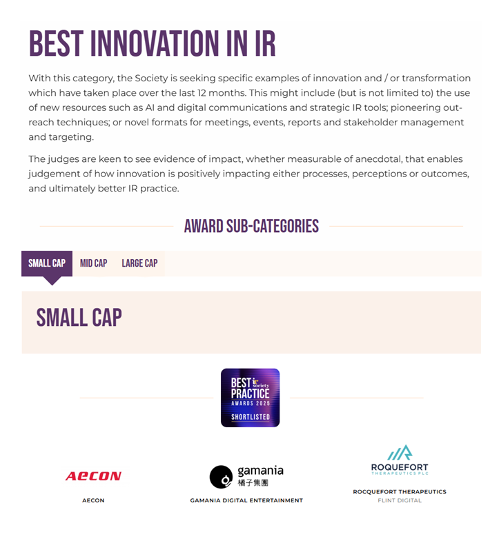 The Investor Relations Society (IR Society), founded in 1980, is one of the world’s most influential professional organizations in investor relations. It aims to promote the advancement of IR professionalism and global exchange. Its Best Practice Guidelines are widely adopted across European markets. Each year, it organizes the global “Best Practice Awards” to recognize distinguished performance in areas such as sustainability communication, innovation, corporate websites, annual reports, and IR programs. The awards honor listed companies internationally that demonstrate outstanding achievement in investor relations.