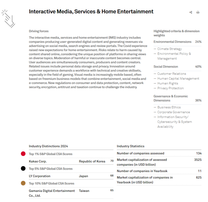 國際永續評鑑比機構標普全球(S&P Global)之《2025永續年鑑》(The Sustainability Yearbook 2025),針對全球62個產業、7,690家上市櫃企業進行永續發展績效評分,本次全球共計780家領先企業入選年鑑。其中「互動媒體娛樂業(IMS, Interactive Media, Services & Home Entertainment)」前三名企業:第一名 韓國 Kakao Corp.、第二名 日本 LY Corporation、第三名 台灣 橘子集團。